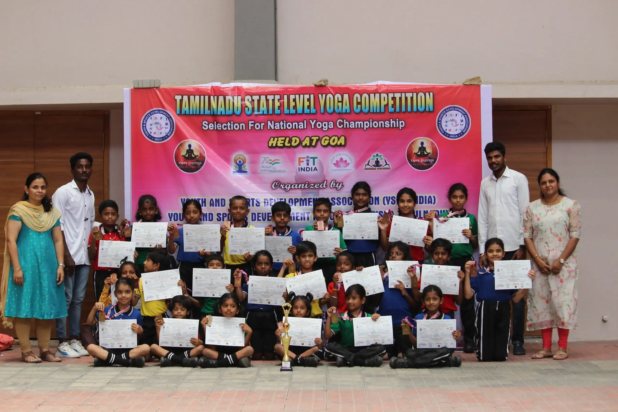 A majestic 10-ft trophy was awarded separately for boys and girls, honoring their dedication, grace, and excellence in yogasana practice — a true symbol of commitment and achievement.